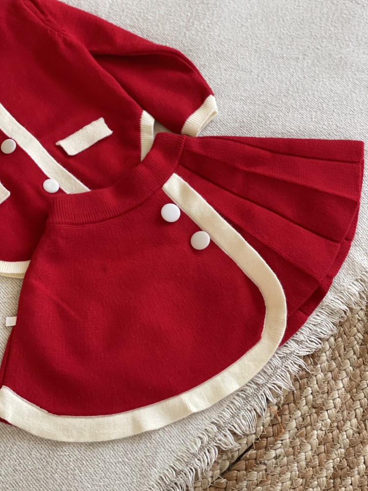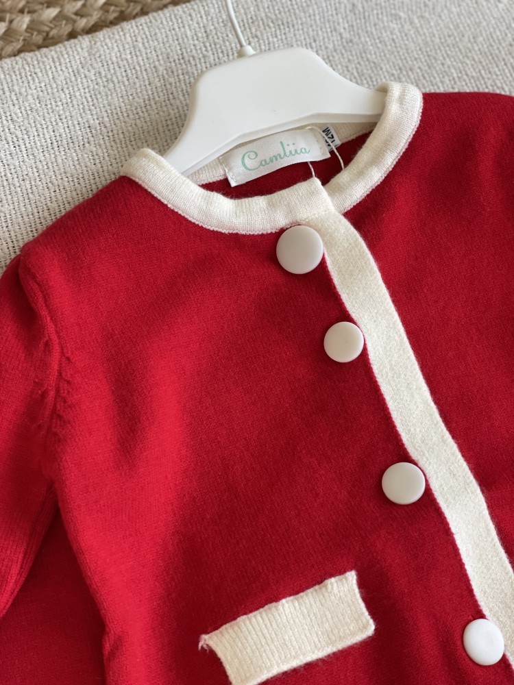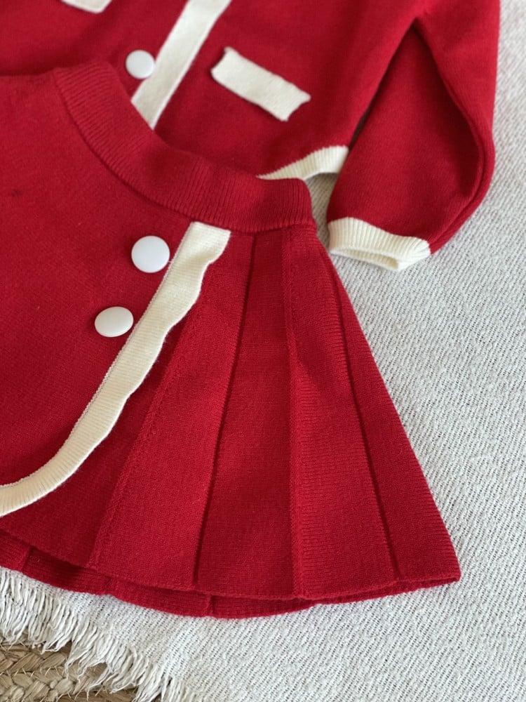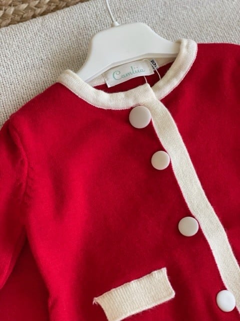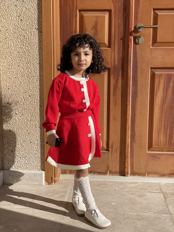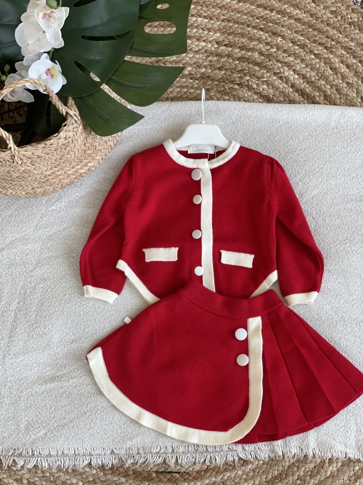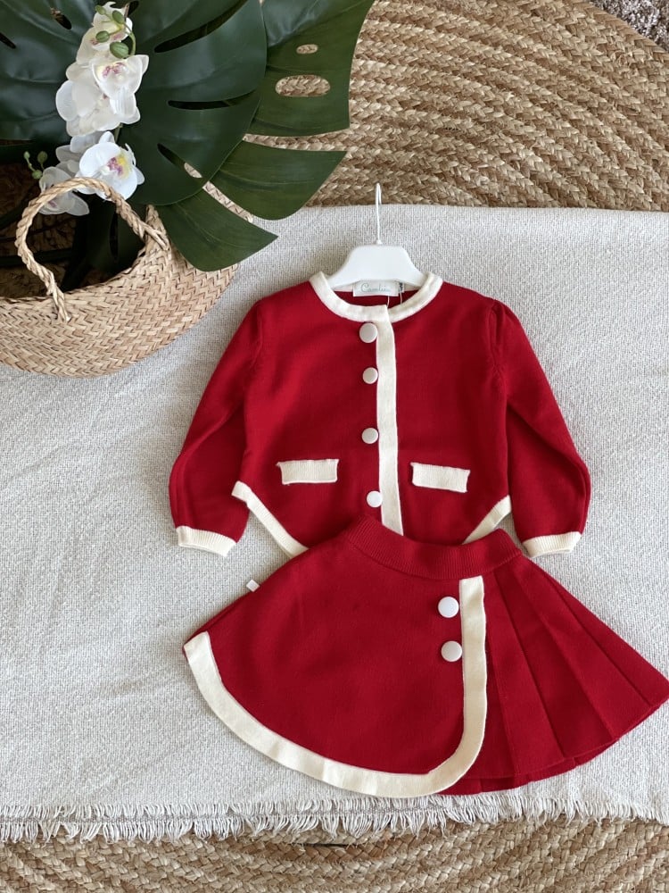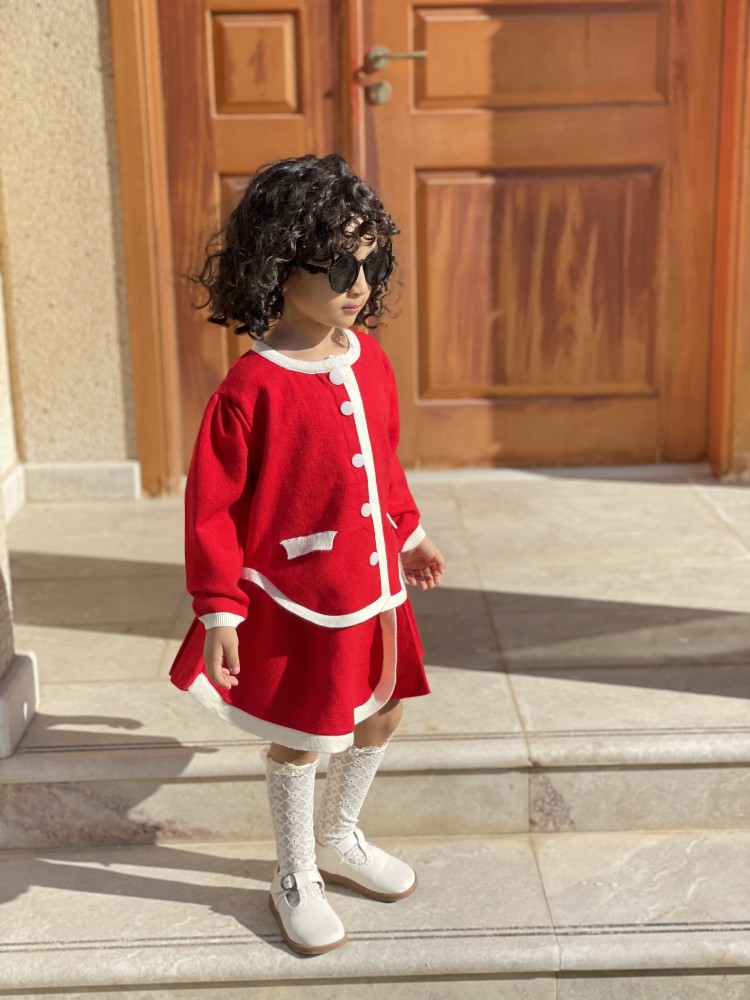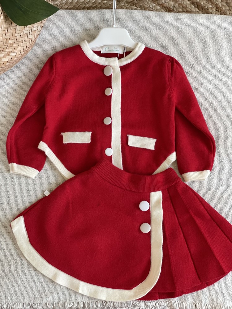 طقم آنيق باللون الأحمر محدد بأطراف البيج ..
