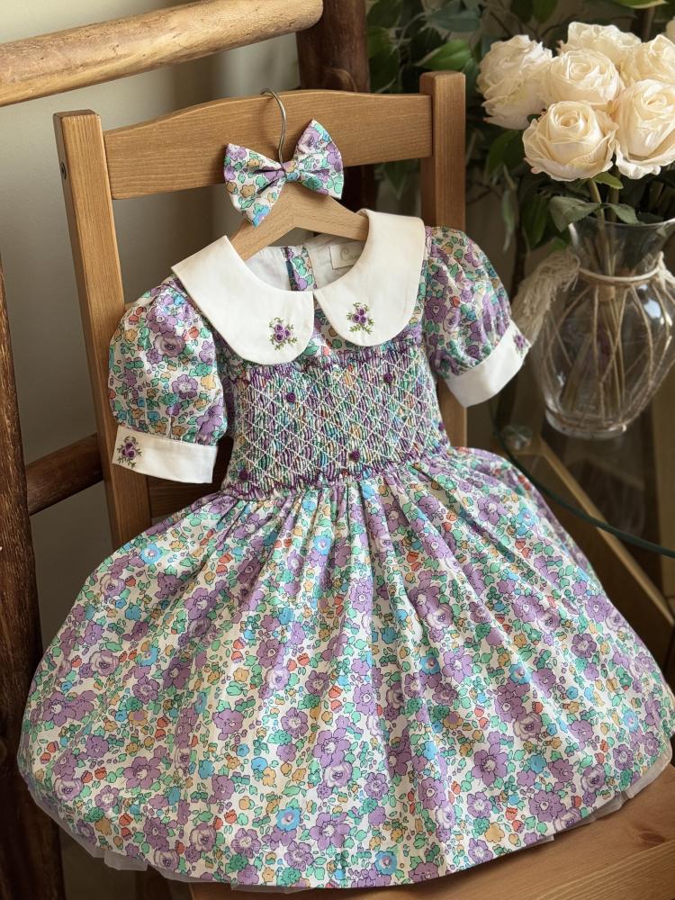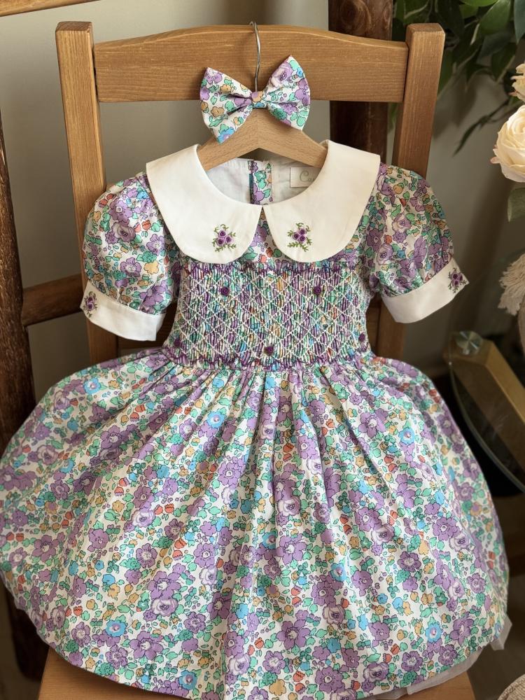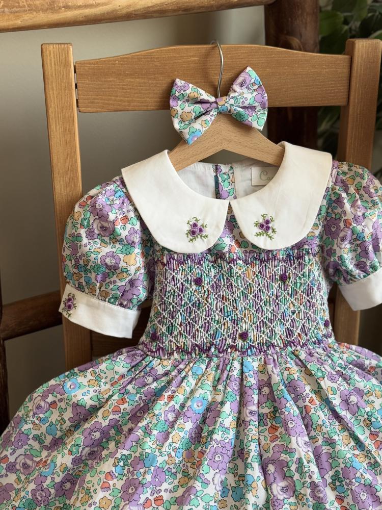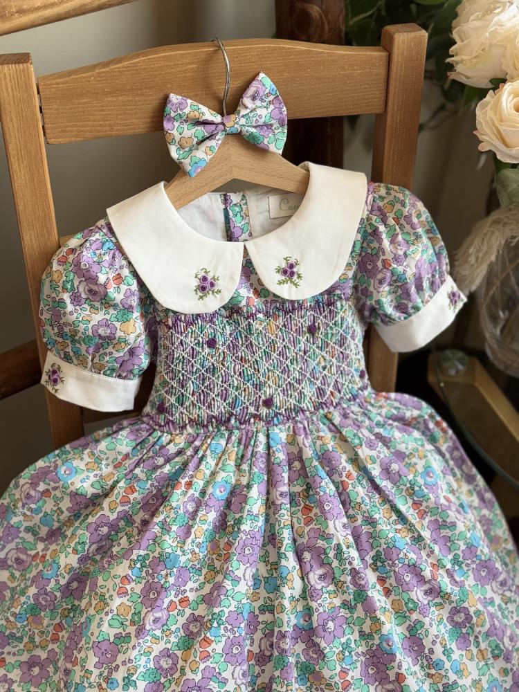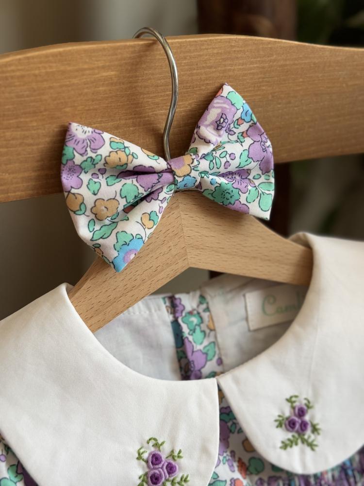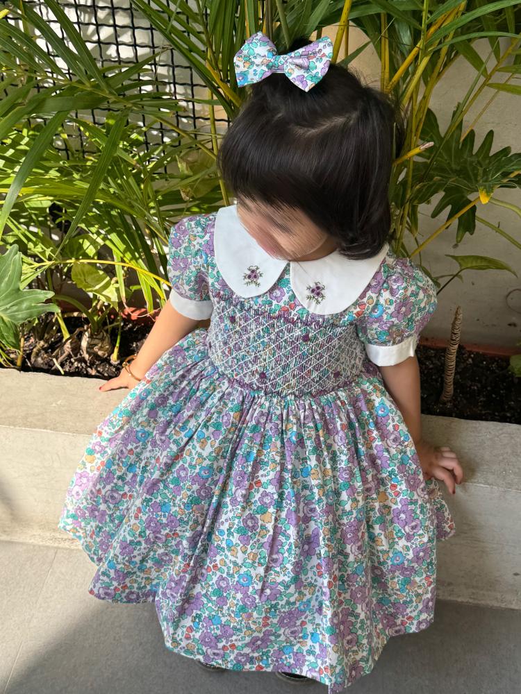 ومعه فيونكة 🎀 للشعر بنفس نقشة الفستان لتكمل الإطلالة بجمال وأناقة، مثالي لكل أميرة صغيرة تحب التألق!